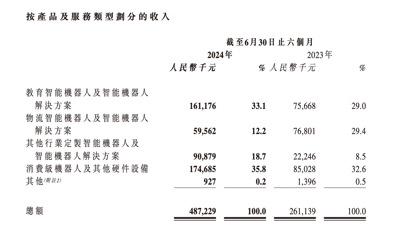 具体来看,优必选消费级机器人及其他硬件设备、教育智能机器人及解决方案两大主要业务上半年收入分别为1.7亿元和1.6亿元,同比增长均超一倍,占总收入的35.8%和33.1%。其他行业定制智能机器人业务实现收入9087.9万元,同比增长309.5%,占总收入的18.7%,相较于去年的8.5%提升了10个百分点。物流智能机器人及解决方案业务收入5956.2万元,同比减少22.4%,占总收入的12.2%,相较于去年同期的29.4%大幅降低。