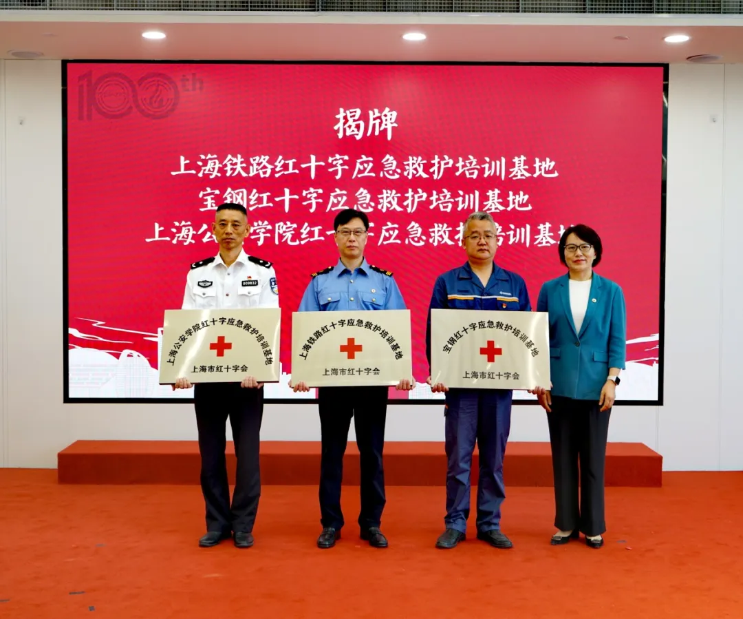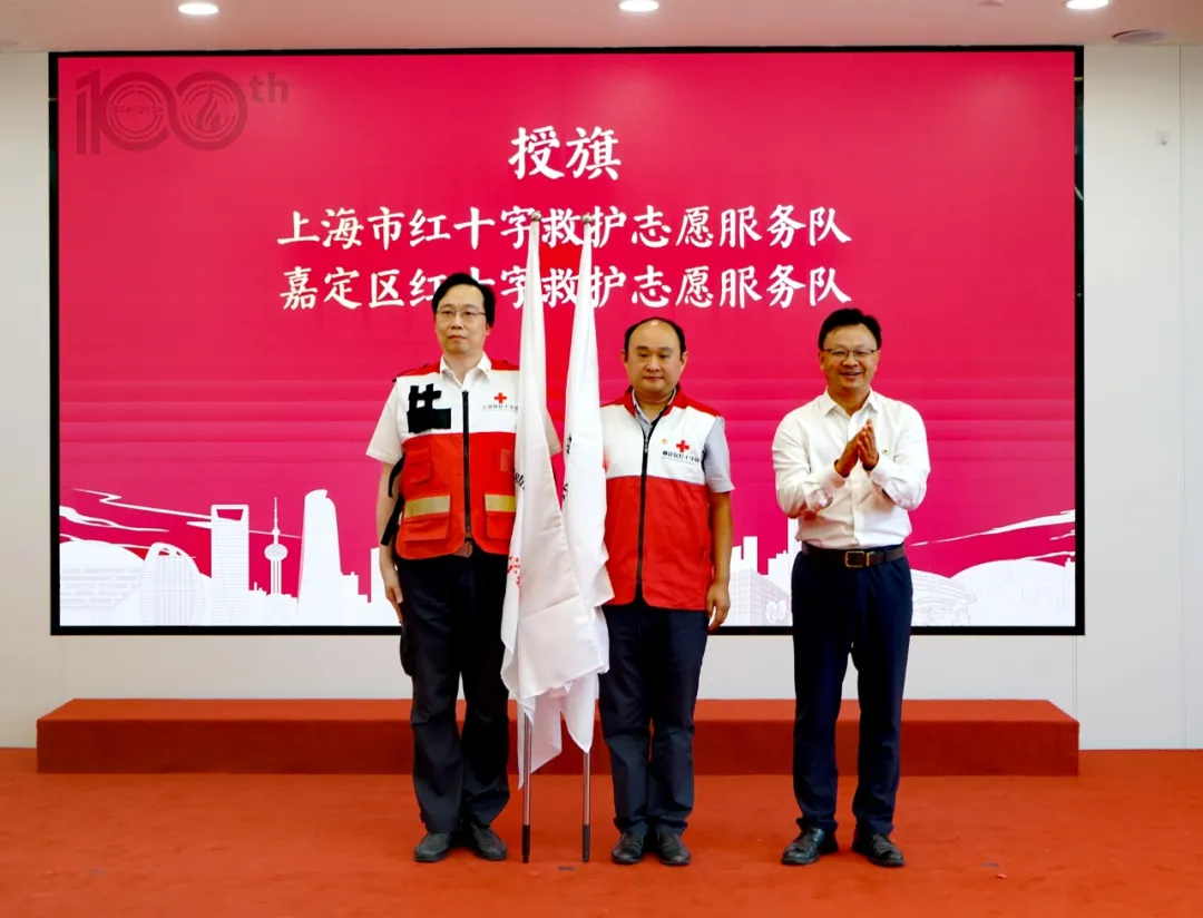 会上,李江英为中国铁路上海局集团红十字会、宝武集团红十字会、上海公安学院红十字会新设立的三家上海市红十字应急救护培训基地授牌。通过三个基地的辐射,救护培训将纳入到铁路、宝钢、公安行业从业人员的职业培训体系中。市红十字会副会长万兴旺为上海市和嘉定区红十字救护志愿服务队代表授旗。市、区两级红十字会将秉持“人民至上,生命至上”重要理念,通过组建红十字救护志愿服务队,凝聚更多持证红十字救护员的力量,真正实现“红十字救在身边”。