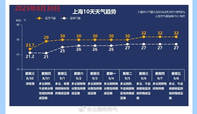 上海本轮高温天气将贯穿双休日和开学日,最高气温在35℃左右。午后的阵雨或雷雨范围小,时间短,对出行影响不大,但洗晒还是要留意。下周中后期,海上有热带系统活动,偏东气流再度带来充沛的水汽,散装的阵雨或雷雨天气变得频繁起来。但由于今年的副热带高压实在强势,上海主要还是受其影响,气温没有明显下降。