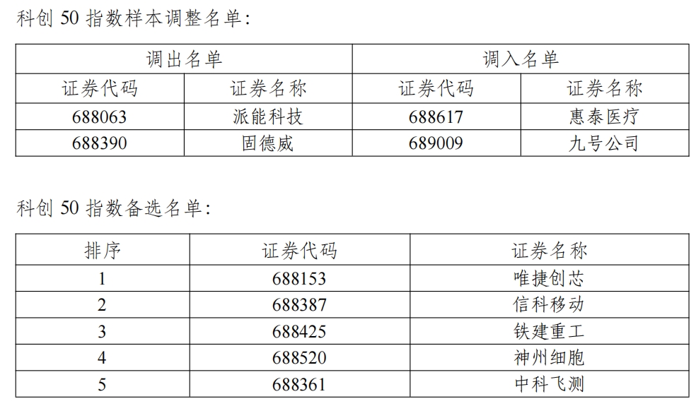 根据指数编制规则,科创50等科创指数样本每季度进行定期调整。本次调整,惠泰医疗(688617)、九号公司(689009)将被调入科创50指数,国盾量子(688027)等6只证券将被调入科创100指数,安恒信息(688023)等7只证券将被调入科创200指数。