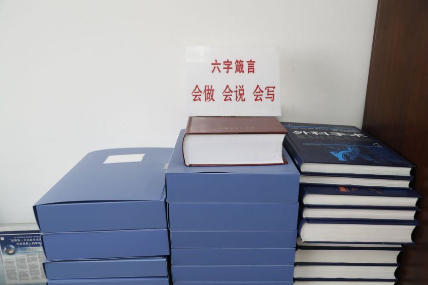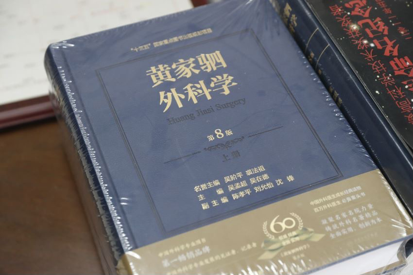 沙发边的老式茶几上放着吴孟超任主编的第八版《黄家驷外科学》。出版于2021年3月的第八版尚未拆封,当时已在病中的老人没来得及看到这部他倾注心血的外科巨著。然而他不知道的是,他的学生沈锋教授已接过接力棒,担任《黄家驷外科学》第九版主编。后辈们薪火相传,擎起了火炬……
