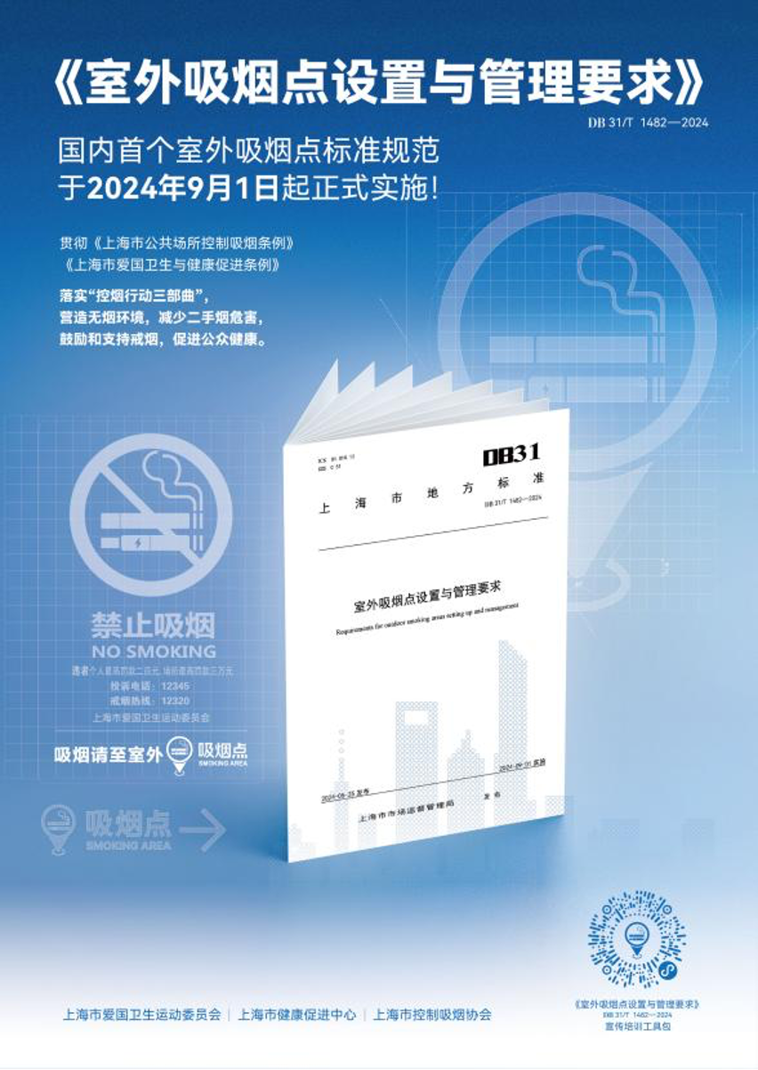 为做好地方标准的宣传推广和落地应用,上海市爱卫会、市卫生健康委近日下发《关于印发〈室外吸烟点设置与管理要求〉的通知》,并发布国内首个《标准》宣传培训工具包,用于更有效指导室外吸烟点的规范建设,进一步提升无烟环境建设成效,提升健康上海建设能级。
