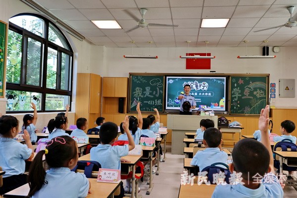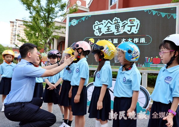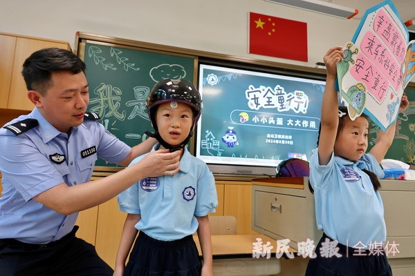 今秋开学季,公安部和教育部等单位以“知危险会避险”为主题,开设2024年秋季开学全国中小学生交通安全主题课,要求让孩子们通过生动形象的传授,理解和学习交通安全法律知识,提升交通安全自护意识,理解生命安全的意义。图为金山区前京小学新学期结合安全“童”行主题教育活动,邀请金山卫镇派出所民警带来“小小头盔 大大作用”小课堂,通过完成头盔的正确佩戴,一年级小朋友化身为小小安全宣传员。