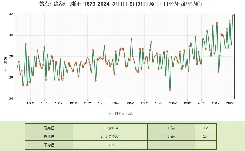 徐家汇站1873-2024年8月日平均气温平均值。上海天气发布 图
