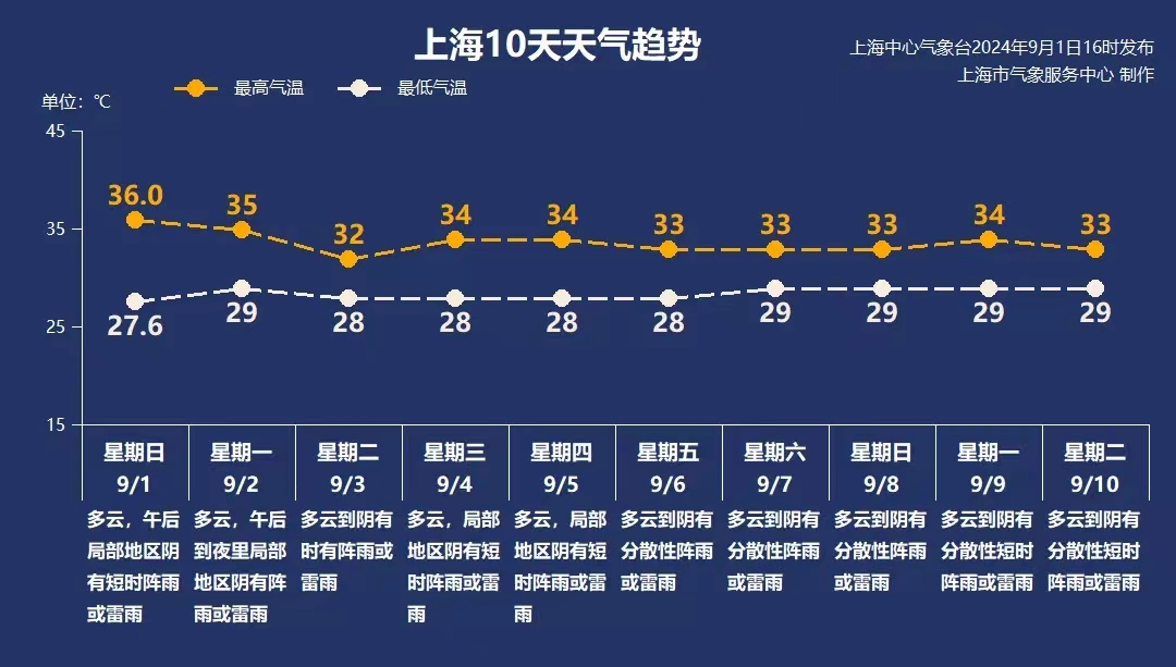 九月的第一天,上海徐家汇站最高气温36.0℃,这是今年的第48个高温日,暂居徐家汇站高温日历史排名第3位。午后松江和闵行等地出现阵雨天气,雨水范围小,时间短,影响不大。