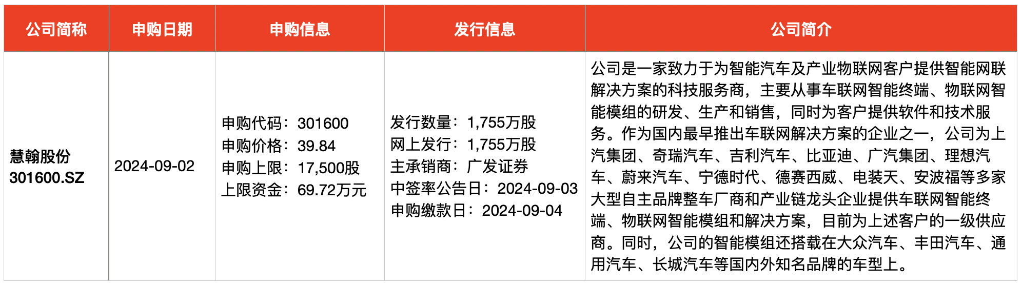 澎湃新闻根据Wind及公开信息梳理统计,9月2日-9月6日,A股安排3只新股网上申购,暂无新股上市。申购的新股分别为慧翰微电子股份有限公司(简称“慧翰股份”,301600.SZ)、安徽中草香料股份有限公司(简称“中草香料”,920016.BJ)、浙江众鑫环保科技集团股份有限公司(简称“众鑫股份”,603091.SH)。其中,智能车联网龙头慧翰股份是广汽集团供应商,上汽集团亦为公司股东及第一大客户;众鑫股份则是星巴克供应商。