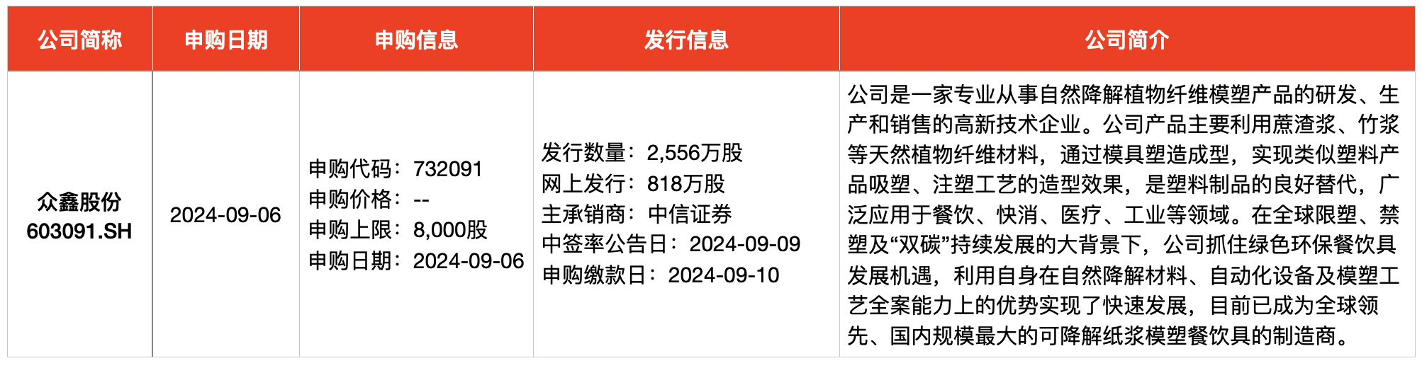 根据华金证券研报,众鑫股份深耕可降解纸浆模塑餐饮具领域近20年,能够独立提供从前道的外观设计、样品制造、产品生产到后续风险管控的一站式点对点的整体解决方案,成为了国际头部包装生产商的重要供应商,并借助客户的销售渠道优势覆盖各餐饮、商超等终端,远销至80多个国家及地区;2022年,公司在纸浆模塑餐饮具领域的全球市占率约达16%。目前,公司仍在积极开拓新优质客户以巩固自身行业地位,现与星巴克共同开发用于杯盖生产的专用模具;与知名日用快消品牌商Reynolds Consumer Products对接、现已开启小批量试样;与澳大利亚环保食品包装企业Biopak达成业务合作、2024年上半年销售额超2000万元。
