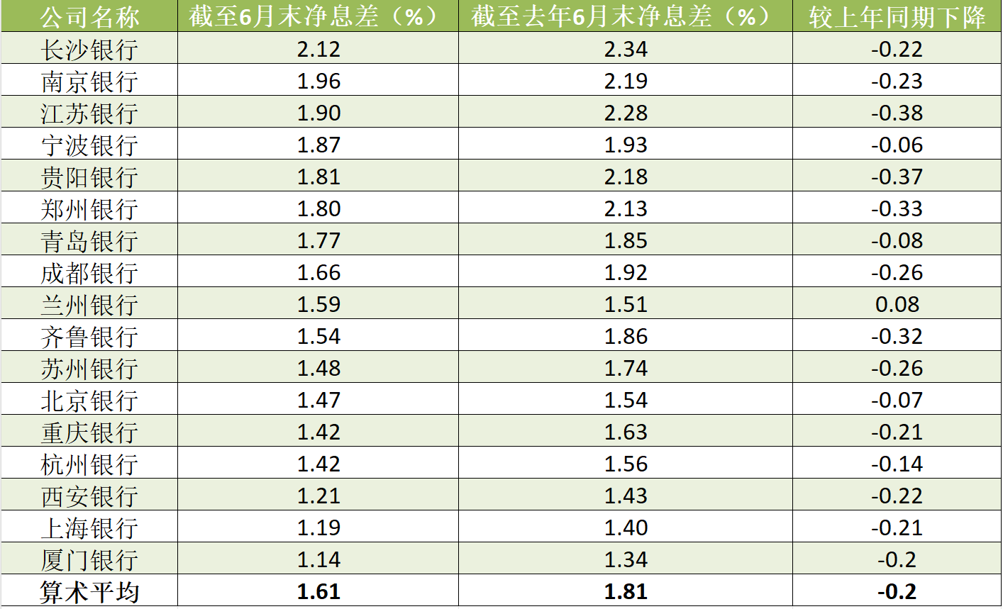 截至2024年6月末,A股上市城商行净息差 数据来源:Wind