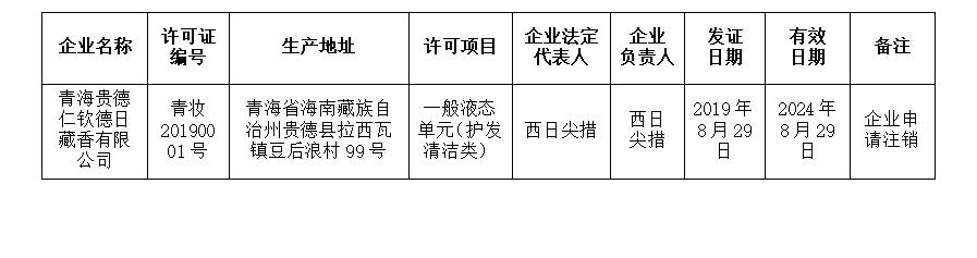 根据企业申请,依据《中华人民共和国行政许可法》第七十条、《化妆品生产经营监督管理办法》第二十三条之规定,依法注销青海贵德仁钦德日藏香有限公司《化妆品生产许可证》,现予以通告。