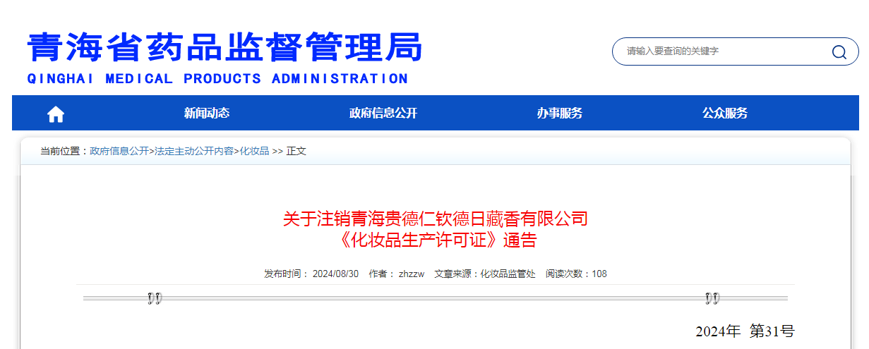 中国质量新闻网讯 近日,青海省药品监督管理局发布关于注销青海贵德仁钦德日藏香有限公司《化妆品生产许可证》通告。