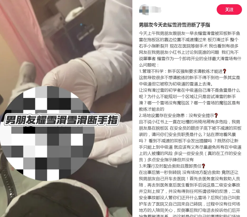 昨天(1日),一名网友在社交媒体发文称:自己在耀雪滑雪时,在已经刹车减速的情况下,被后方的双板新手撞到,导致板刃割伤手指,被送进医院接手指。