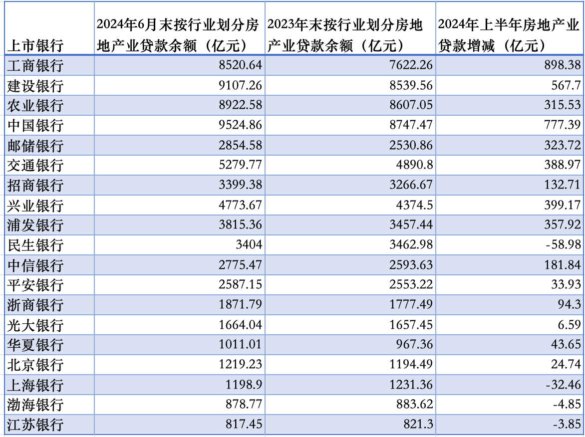 国有六大行今年上半年的房地产业余额全部增长。