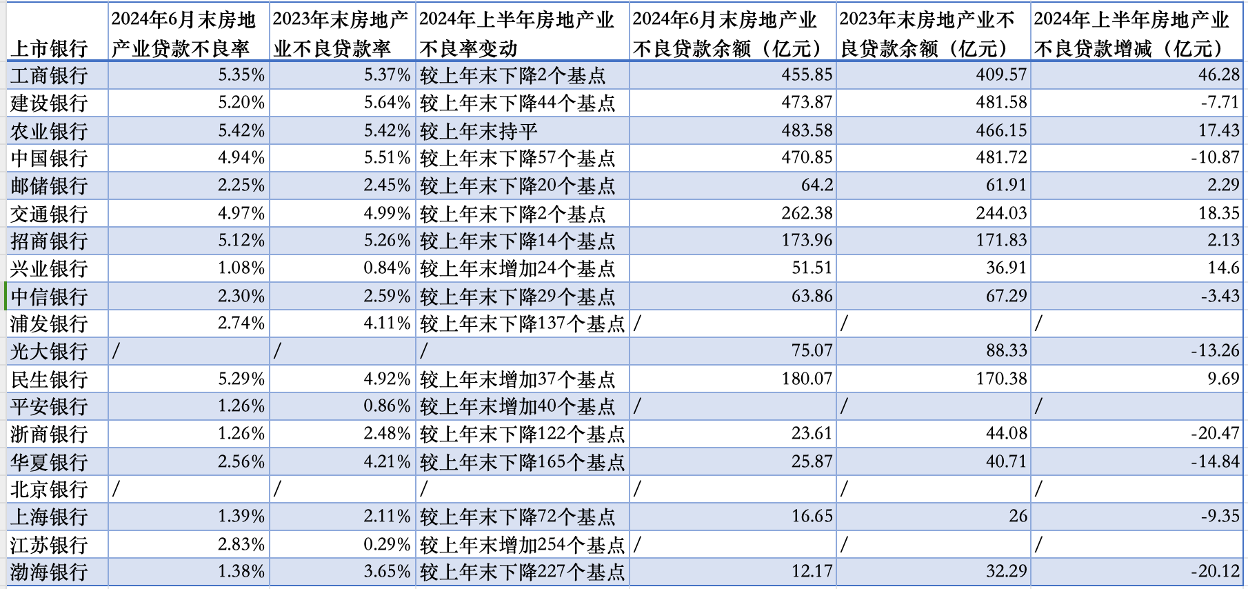 今年上半年大中型银行房地产业贷款资产质量情况“/”表示当期业绩报告中未披露相关数据