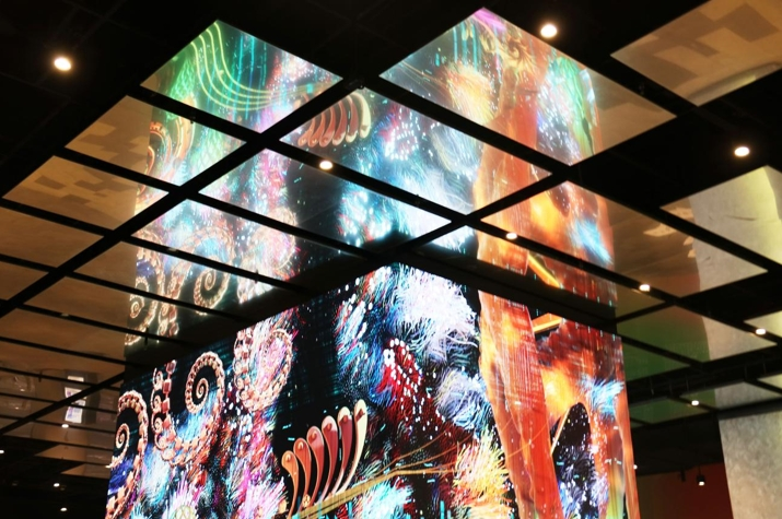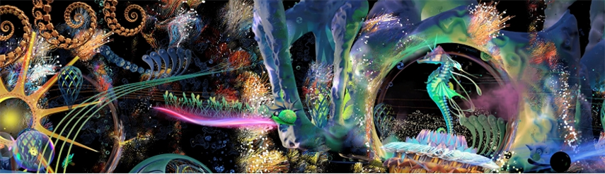 “海的诗歌”中,海洋成为时间和空间的容器,粒子以独特的形式扩散开来,书写蓝鲸的声波、海龟的浮游、水母的微动。这些远古生物似近似远,引领观众的目光;大自然在“花的印记”中呈现为多彩的姿态,百花齐放中生灵蓬勃,观众好似置身于花丛之中,感受生命的美好景象;在“城的旋律”中,人类璀璨文明的符号成为视觉中心:吉萨金字塔建筑群柱、显微镜、早期飞行工具飞艇、热气球…… 数字化的大卫雕像作为人类的缩影,并辅有发电机、基因、未来飞船等更现代的元素,诠释属于全人类的文化成果。 前三章的元素在最后“梦的秘密”中碰撞相遇,最终勾勒出一只眼睛。眼睛睁开的瞬间,过往似庄周梦蝶般消散,睁眼定格科技与产业,城市与自然的当下,远观未来。 在色彩上,艺术团队使用了叠混的方法,每一种元素和图层都设计了数十种,利用动画软件中各种色彩计算的方法,进行层层叠加和融合,从而营造出色彩流动的质感,恍如梦境。