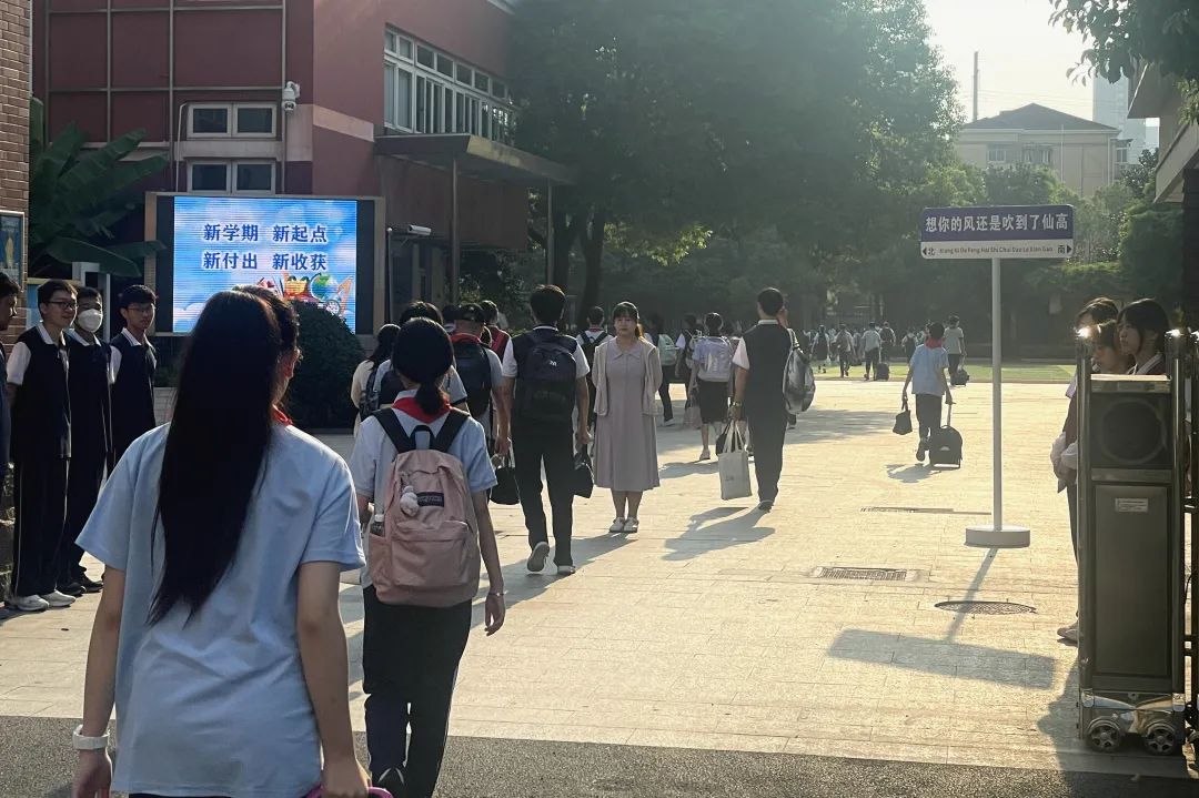 早上7点15分,仙霞高中高二学生李明萱准时出现在校门口。作为今天的执勤生,她带着微笑与老师们一同在校门口迎接久违的同学们。在她身旁,竖立着一块蓝色路标牌——“想你的风还是吹到了仙高”,这几个大字把新学期的入学仪式感瞬间拉满。