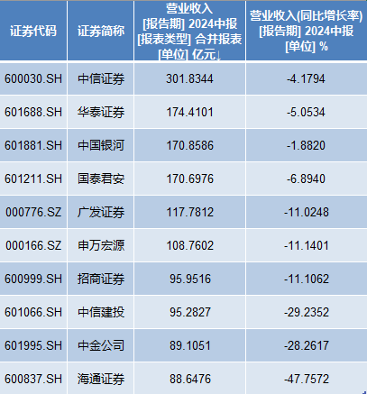 值得一提的是,今年上半年,营收排名前10的上市券商,营收全部出现下滑。除海通证券外,中信建投、中金公司下滑超过20%,申万宏源、招商证券、广发证券降幅超过10%。