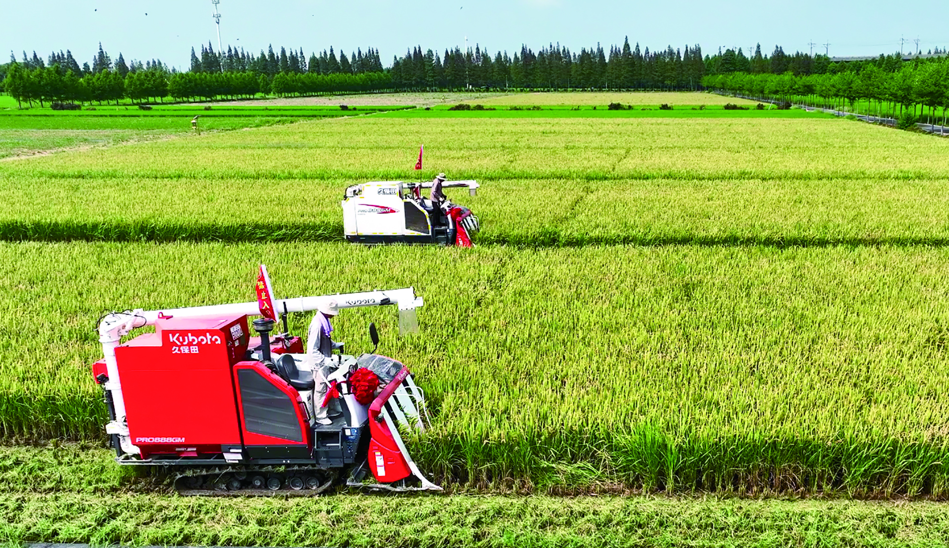 在上海汇民农业专业合作社,100亩“国庆稻”在微风轻拂下掀起层层稻浪,饱满的稻穗在阳光下泛着金色,伴随着机器的轰鸣声,稻田里,3台久保田888联合收割机来回穿梭,割稻、脱粒、转运等工序一气呵成,空气中弥漫着清新的稻香,处处洋溢着丰收的喜悦。依托现代化加工生产设备,低温烘干、精细碾磨,只需要几天时间,开镰新米就将抢“鲜”上市。