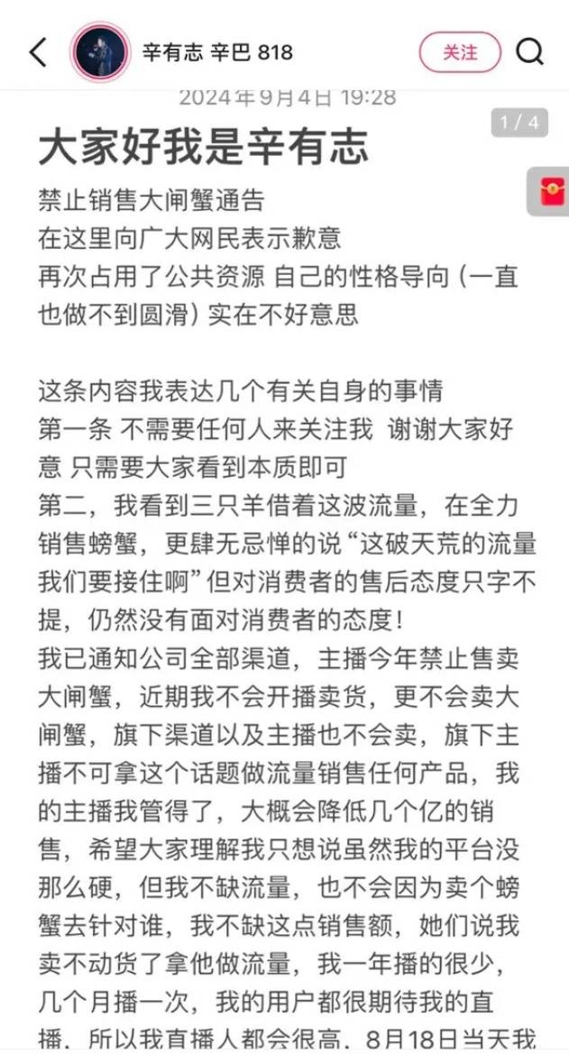 9月4日晚间,辛选集团创始人辛巴在快手发文称,已通知公司全部渠道,主播今年禁止售卖大闸蟹。他表示,近期自己不会开播卖货,更不会卖大闸蟹,旗下渠道以及主播也不会卖,旗下主播不可拿这个话题做流量销售任何产品。