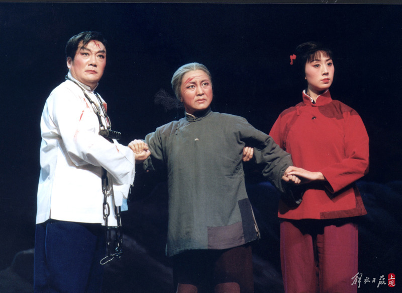 为纪念反法西斯战争胜利55周年,上海京剧院复排的现代京剧《红灯记》在逸夫舞台首演。 图为李玉和(章晓申饰)、李奶奶(胡璇饰)和李铁梅(史依弘饰) 祖孙三代雄赳赳气昂昂赴刑场。 本报记者金定根摄