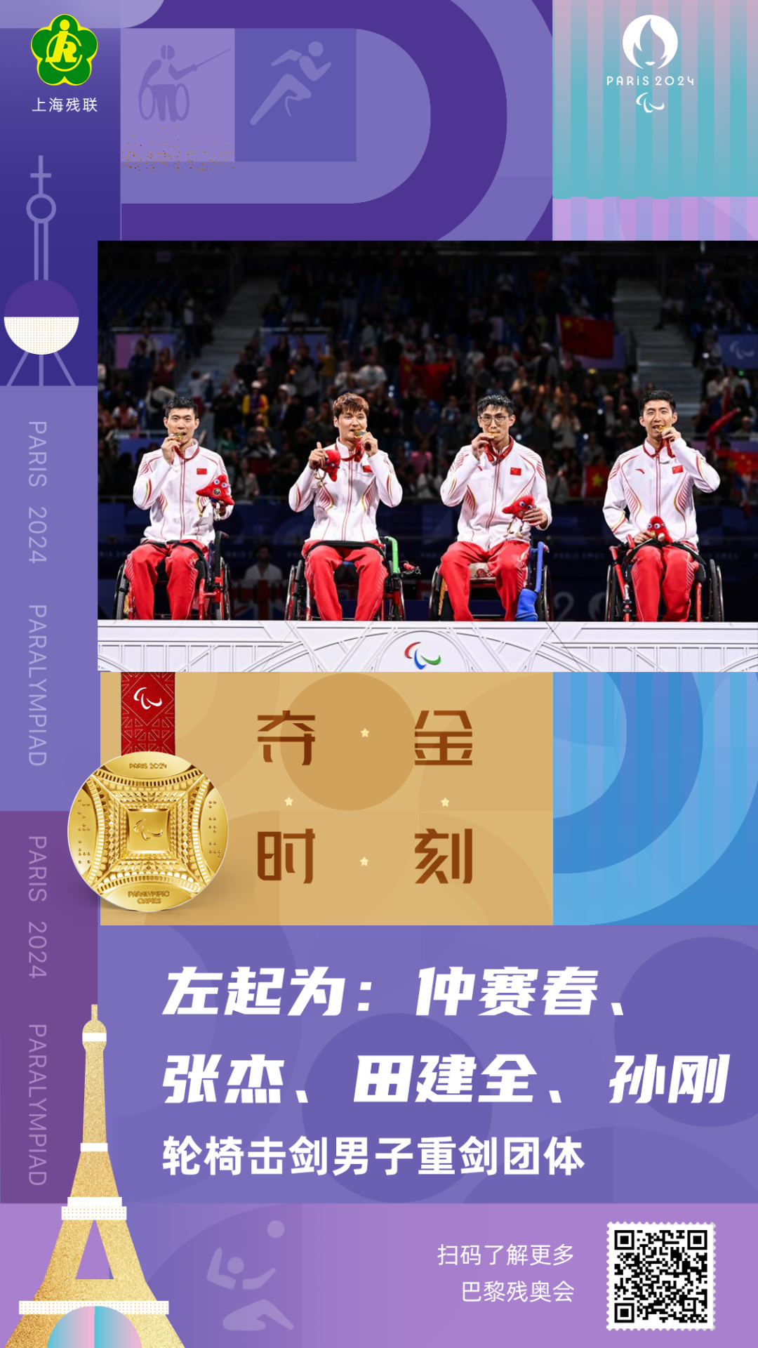 上海市残联介绍,当地时间9月7日,在巴黎残奥会轮椅击剑赛场上,中国队上海选手邹绪凤、辜海燕、陈远东与队友康苏获得女子重剑团体比赛金牌。在稍后进行的男子重剑团体比赛中,上海选手张杰也与队友仲赛春、田建全、孙刚一起斩获金牌。中国体育代表团再添两枚团体金牌。祝贺他们!