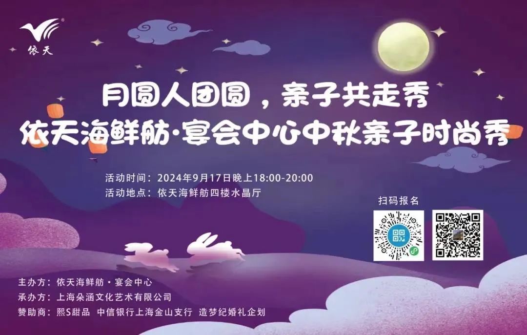 中秋节来临之际,“依天海鲜舫•宴会中心”四楼宴会厅将为大家举办中秋亲子时尚秀活动。本次活动将通过亲子走秀的形式,增进亲子感情,传递节日的喜悦与温情,让您与家人共享温情团圆!