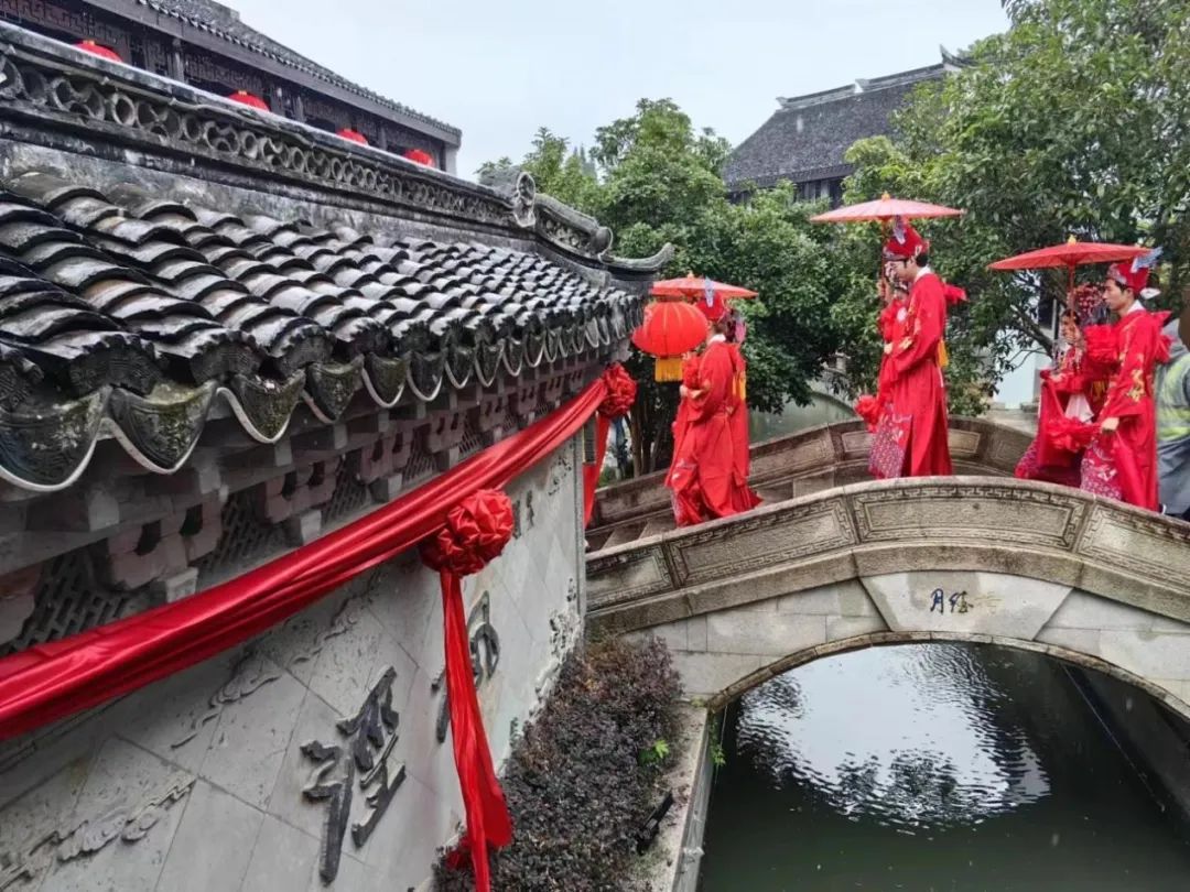 枫泾水乡婚典,一场融合传统与现代、古典与浪漫的婚礼盛典。本届水乡婚典采用宋制婚礼仪式,20对新人身着宋制婚服,行沃盥礼、同牢礼、合卺礼、解缨等传统婚俗。游客可以乘坐传统摇橹船,穿梭于古镇水巷,感受江南水乡的韵味,也可以品尝地道的水乡美食,让味蕾也沉浸在这场浪漫之旅中。