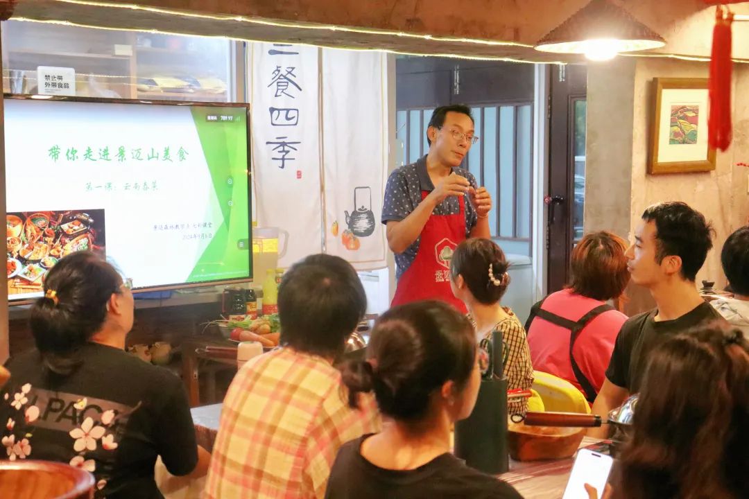 2023年,云南景迈山成为全球首个茶主题世界文化遗产。“景迈山的少数民族美食作为云南一张靓丽的名片,真实地还原和记录了少数民族本土文化。”授课老师鲍一丁介绍道,“后面会陆续带大家制作野山菌、当地土鸡、薄荷炸排骨等,希望以美食为媒介,带着大家感受云南景迈山的人文风土。”