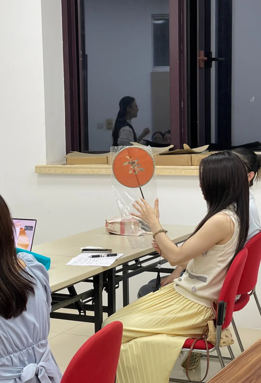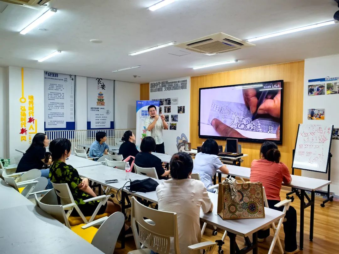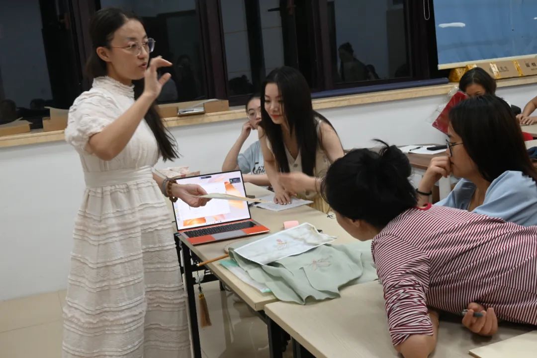 首节课上,冯婧为大家展示了手绣和机绣作品的差别,带着大家开始蝴蝶造型的描样,“后续带着大家学习滚针、打籽绣、盘金绣等刺绣技法,制作宋式团扇等。课程最后,会结合之前学会的技法,绣一个综合类作品,到时候也会邀请老师帮助大家设计一个甲骨文的名字,绣在各自的作品上,作为落款。”冯婧介绍道,“刺绣有一定难度,没想到学员们的热情很高。也希望通过夜校课程,在家乡传承好这一项传统技艺。”