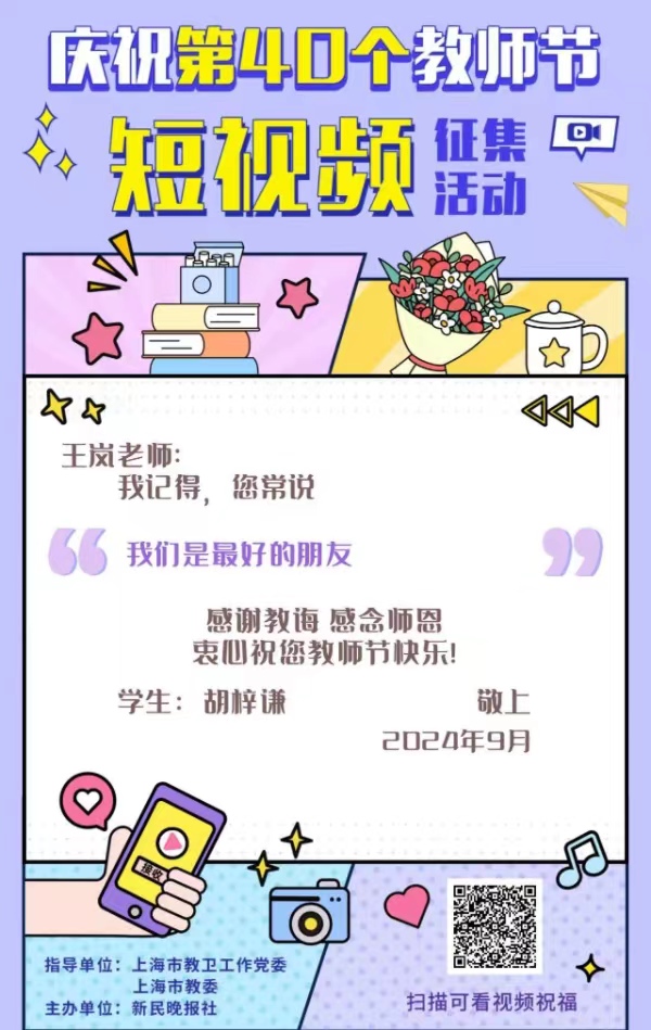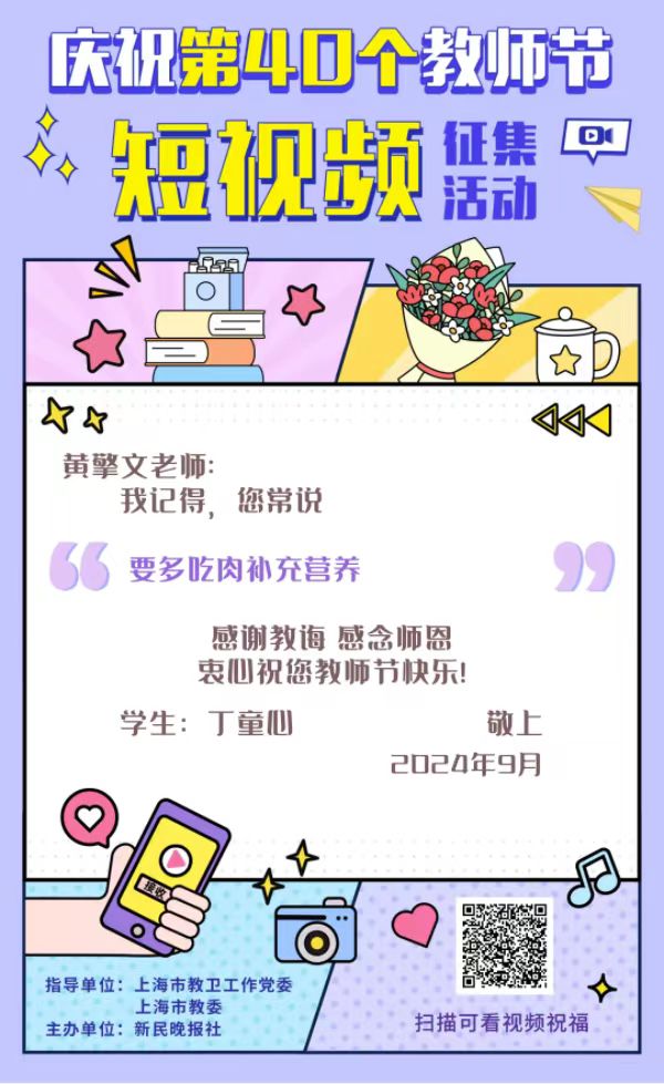 在第40个教师节到来前夕,今年暑假,上海市教卫工作党委、上海市教委联合新民晚报社,共同面向申城大、中、小学生发起短视频征集活动,邀请同学们以“我记得,您常说______”为题,提炼那些安慰过你、鼓励过你、温暖过你、指引过你的只言片语,并讲述背后的小故事。