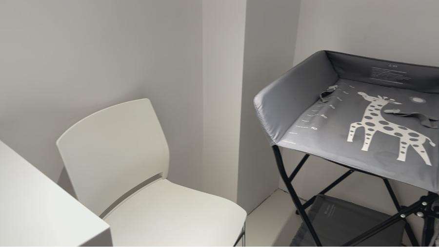 走进这间母婴室,记者的第一感觉就是“挤”。推开门便是一个台盆,其面前地站立区域仅容一人转身,婴儿车要入内几乎不可能。整间母婴室为长方形,台盆旁放置了一张简易的折叠尿布台,哺乳椅也以折叠椅代替,并无空间安装门帘等隐私防护设施。记者还注意到,此处的尿布台已用得有些旧了,灰色的布艺台面上,可见大片污渍。