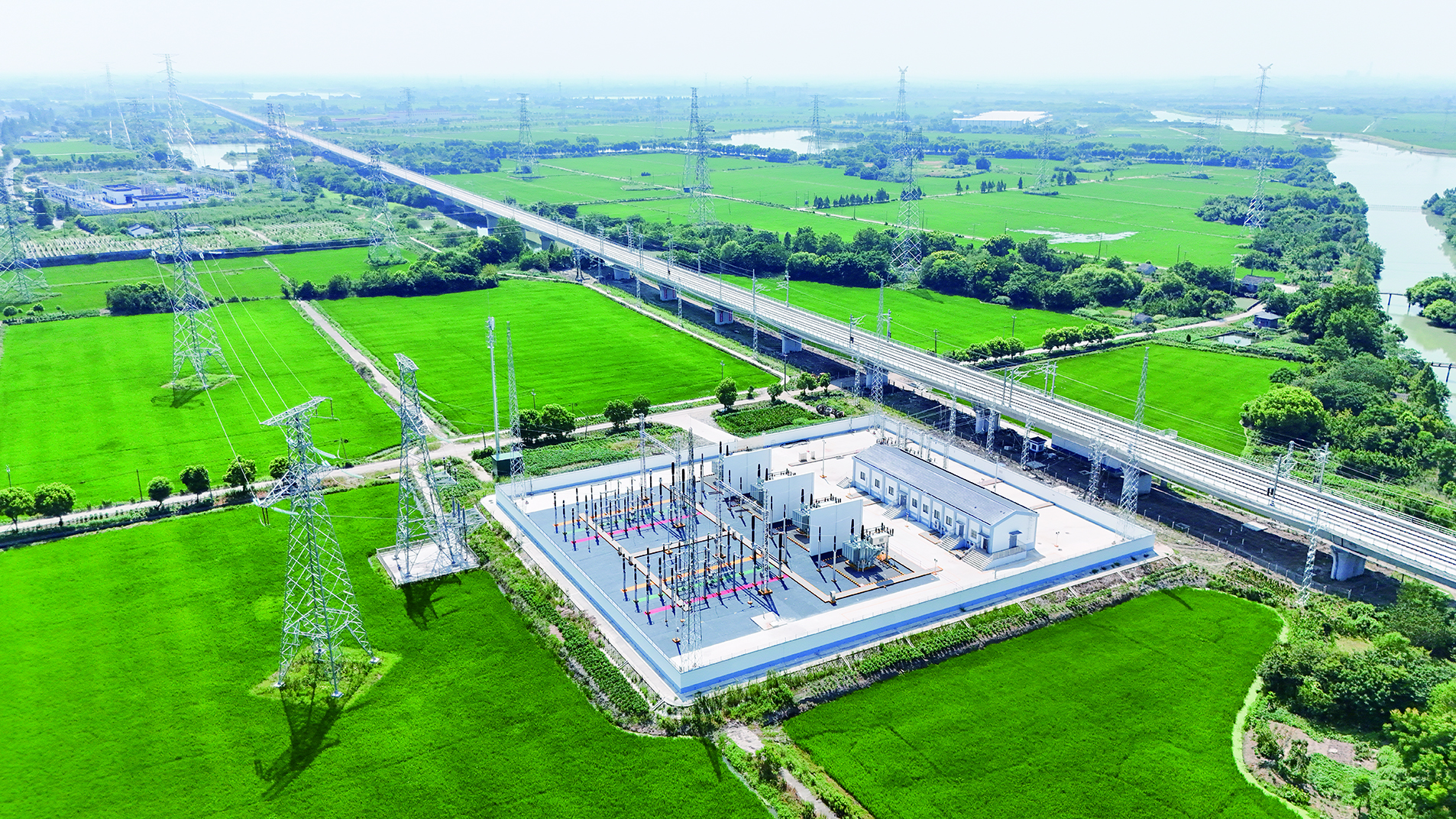 图为沪苏湖高铁湖州东牵引变电所及沿线接触网设备。