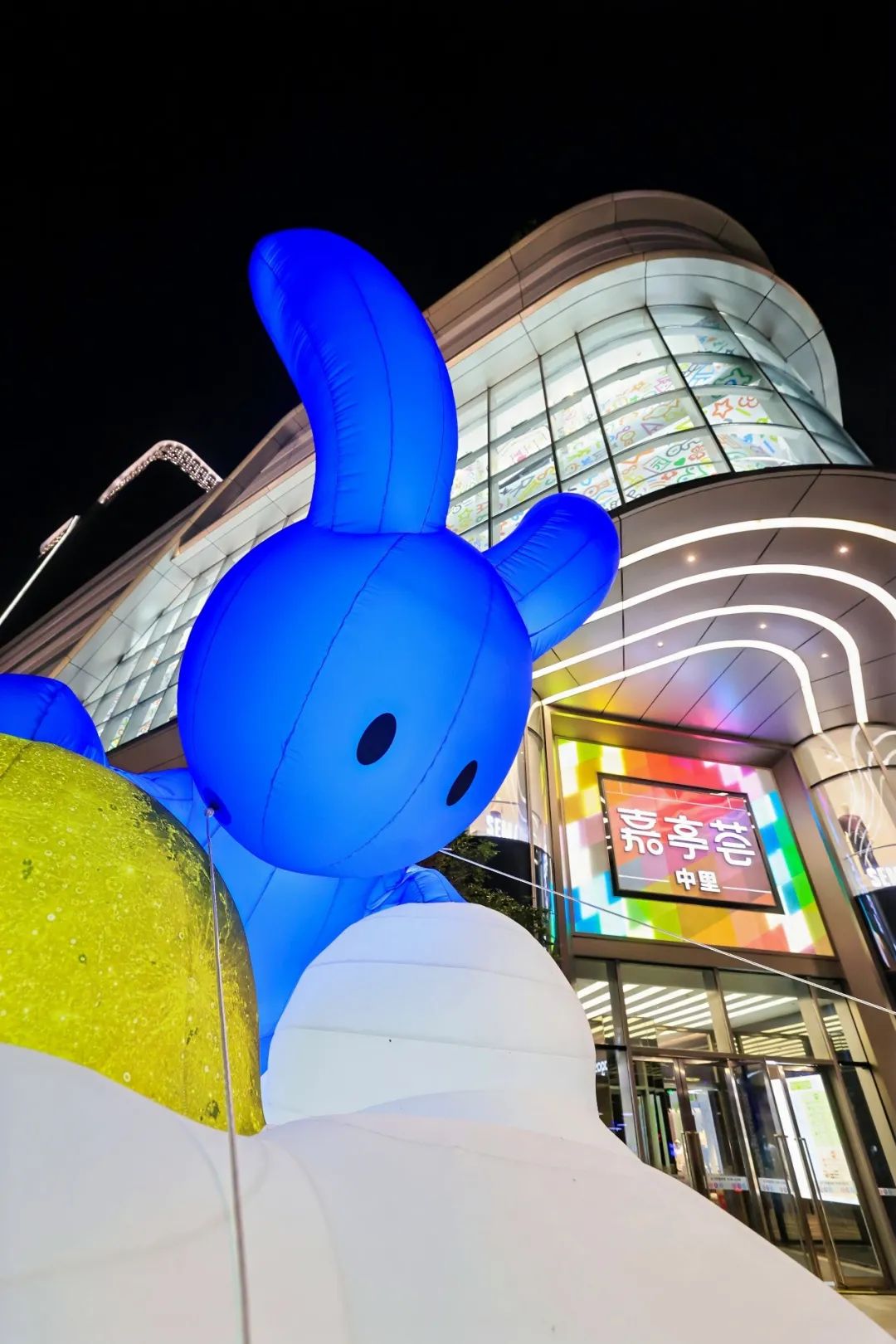 趴在月亮上的紫色兔子、飞翔在空中的蓝红色兔子……走进嘉亭荟城市生活广场,各种造型和颜色的兔子让人眼前一亮。