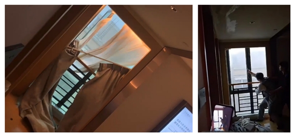 而在全季国兴大道酒店也上演了一场紧急救援。彼时,酒店一间客房窗户被大风刮开,无法上扣,客人立即向前台求助。闻讯后,前台吴国宏与工程人员邢曾宇、王伟华迅速反应,毫不犹豫地赶往现场。三人顶着呼啸的狂风,在重重困难中合力将窗户稳固。