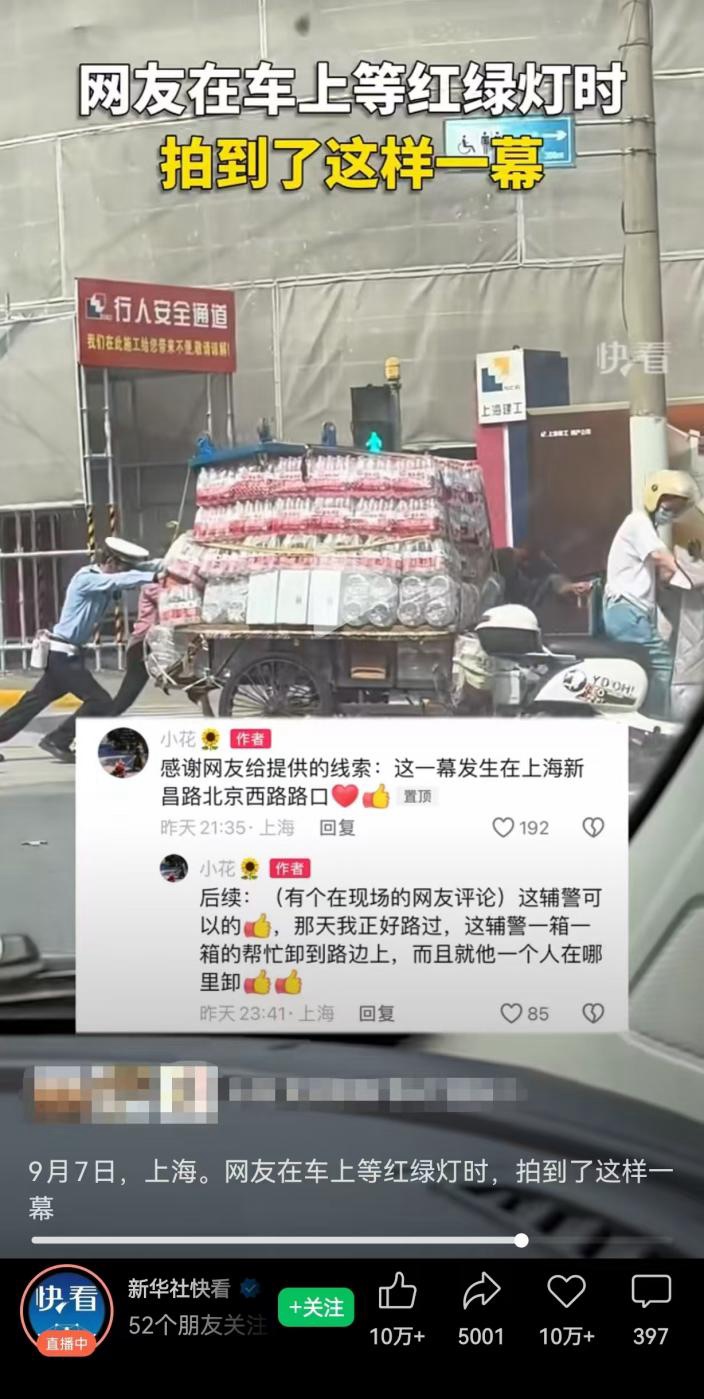 昨天(9月10日),上海街头一位辅警与数位市民烈日下为老人推行满载矿泉水三轮车的视频在互联网上引发大量网民关注与点赞。