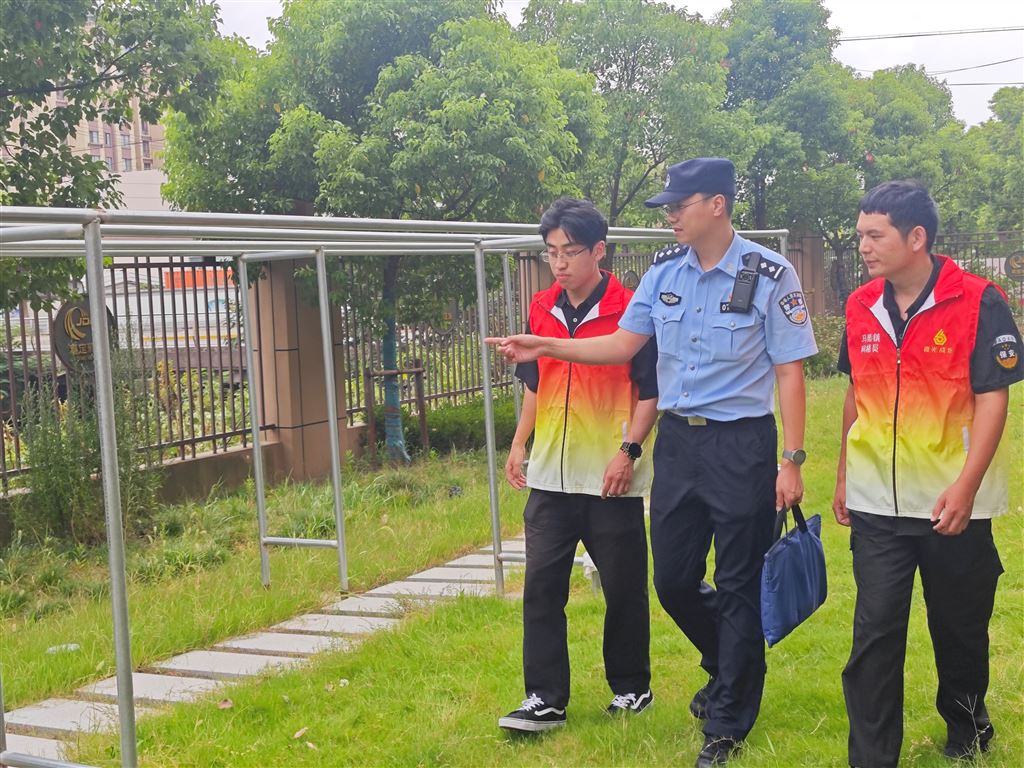 图说:社区民警周炅与网格员一起在小区内选址建立公共晒被点(上海警方供图)
