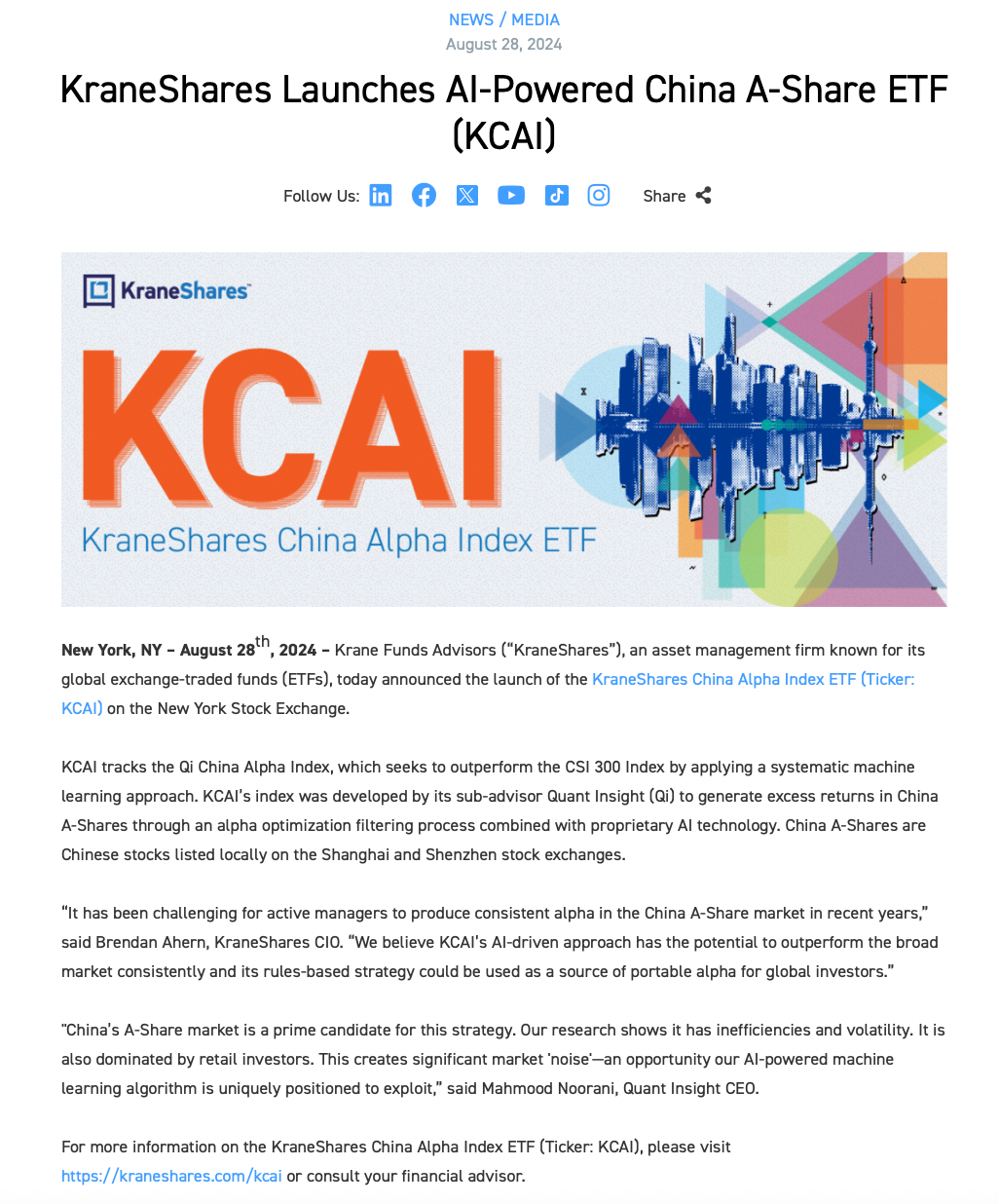 与此同时,8月28日,位于纽约的美国金瑞基金公司(KraneShares)也宣布在纽约证券交易所推出了KraneShares中国Alpha指数ETF(股票代码为“KCAI”)。