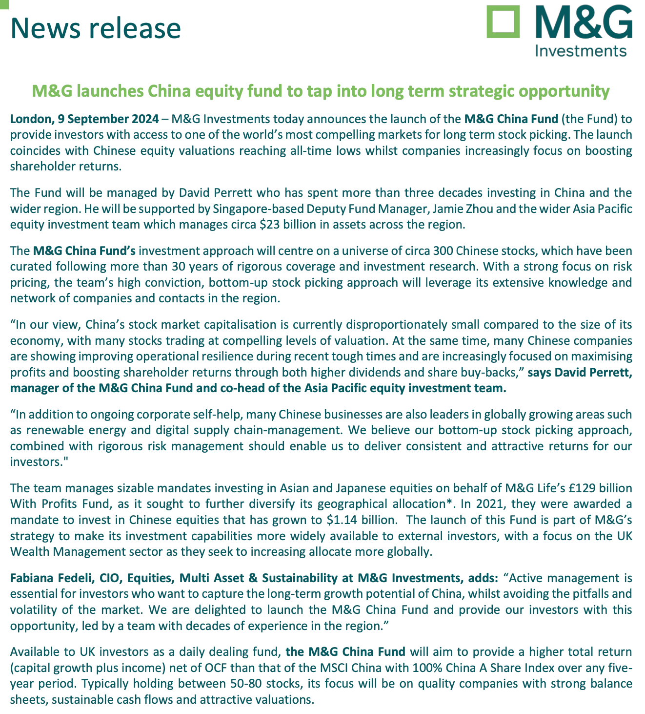 据介绍,M&G中国基金的投资方法将以大约300只中国股票为中心,这些股票均经过M&G投资公司30多年的严格覆盖和投资研究筛选而来。该只基金的目标是在任意五年内,提供比MSCI中国全A股指数(MSCI China with 100% China A Share Index)更高的总回报(包括资本增值和股息收入)。该基金通常持有50至80只股票,专注于拥有强劲资产负债表、可持续现金流和具有估值吸引力的优质公司。