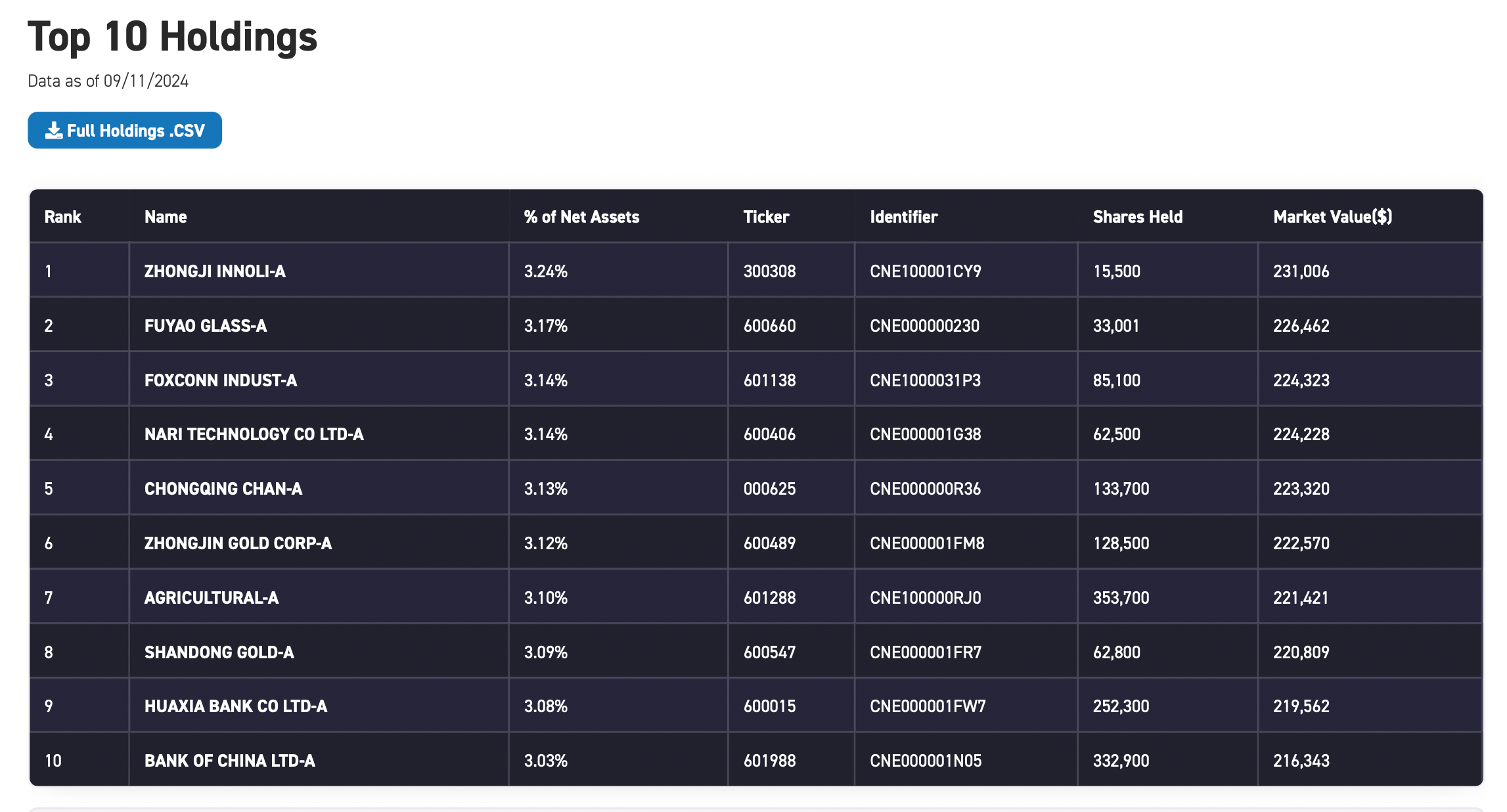 截至9月11日,KCAI基金的前十大重仓股依次为中际旭创(300308.SZ)、福耀玻璃(600660.SH)、工业富联(601138.SH)、国电南瑞(600406.SH)、长安汽车(000625.SZ)、中金黄金(600489.SH)、农业银行(601288.SH)、山东黄金(600547.SH)、华夏银行(600015.SH)、中国银行(601988.SH)。