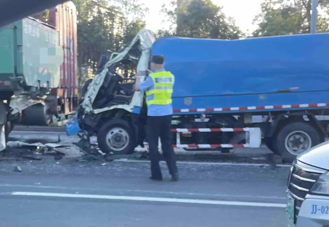 上海外环发生三车事故:环卫车追尾撞上土方车和货车,驾驶员受伤