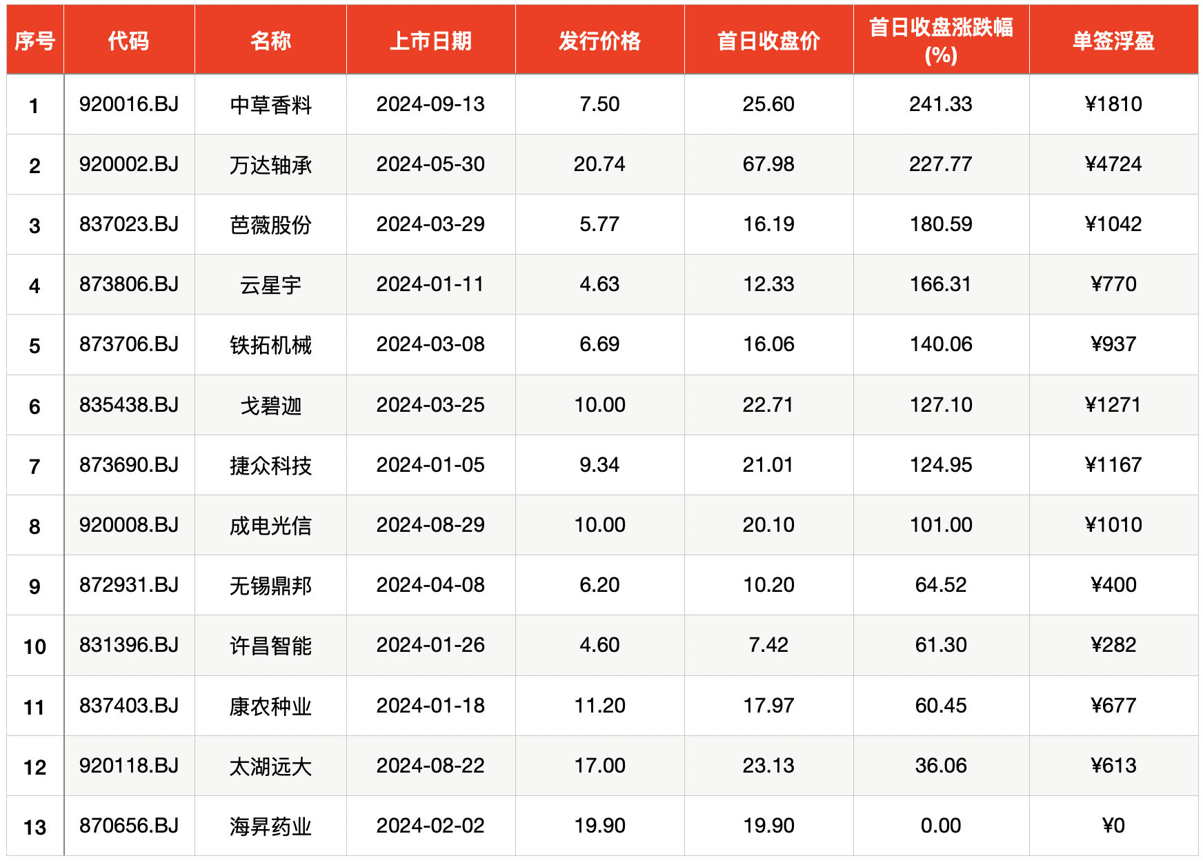 不过,由于北交所新股发行价偏低,中一签仅有100股,北交所打新的赚钱效应较弱。以收盘价计算,中一签中草香料仅有1810元盈利,而今年北交所首日浮盈最高的万达轴承(920002.BJ),单签浮盈也不过4724元。