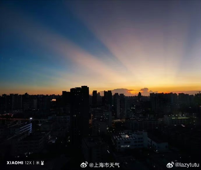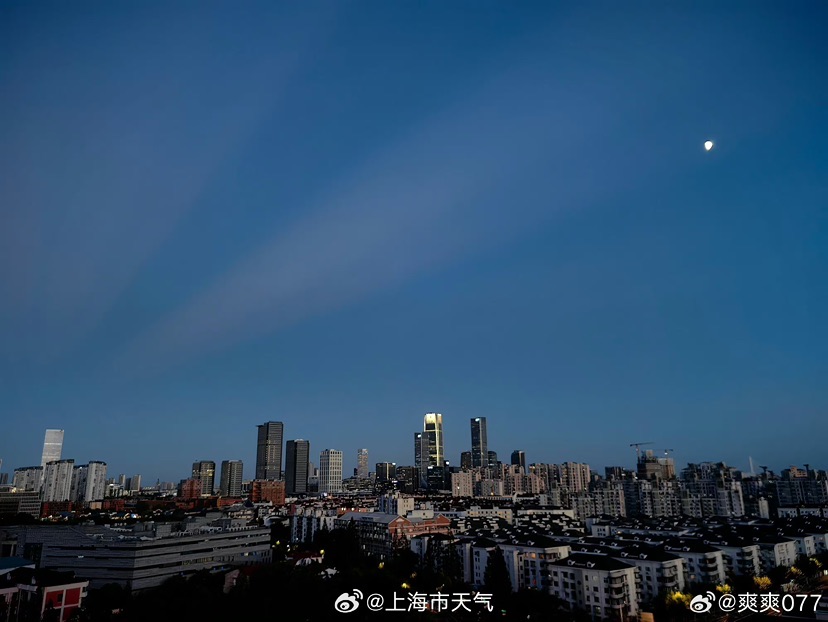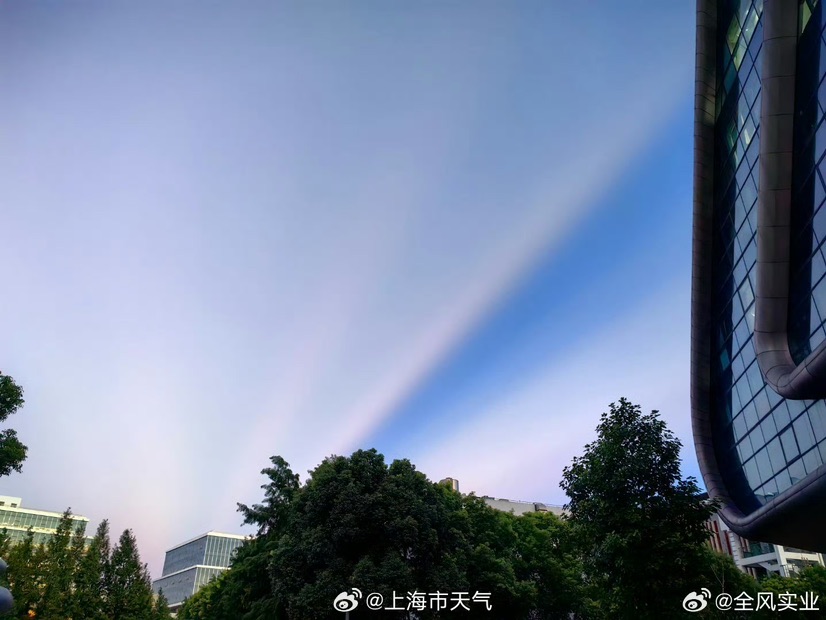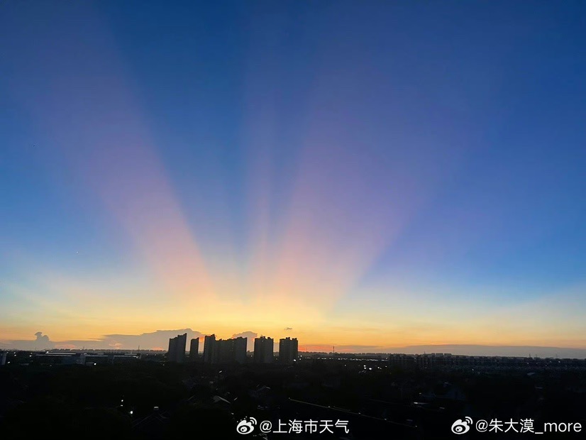 这种现象是怎么回事呢?上海市气象局回应,这种光束一样的现象, 称之为“曙暮光条”,可以算是云隙光的一种。这是由于落日(可在地平线下)光线被远处的积云遮挡,在天空出现的深蓝条纹和光束。