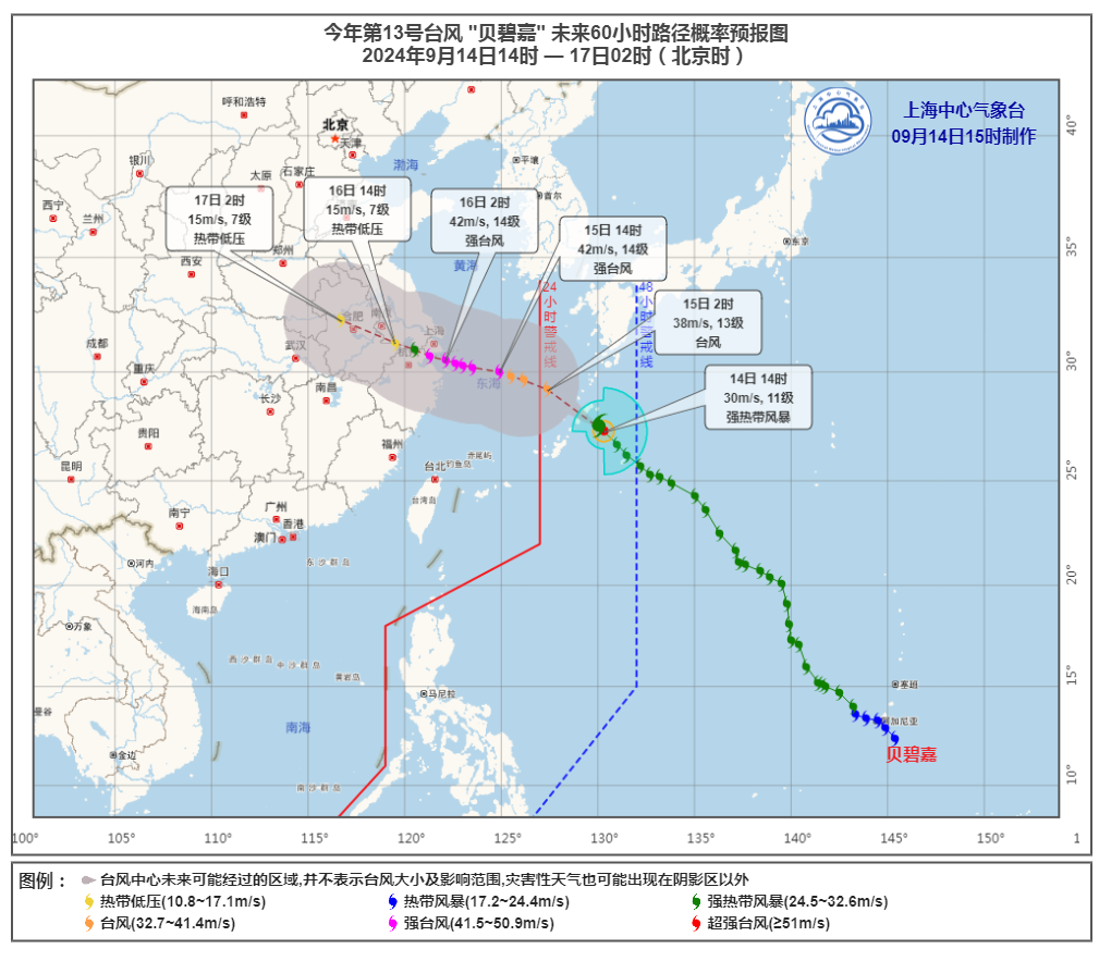 2024年第13号台风“贝碧嘉”路径概率预报图。上海市气象局 图