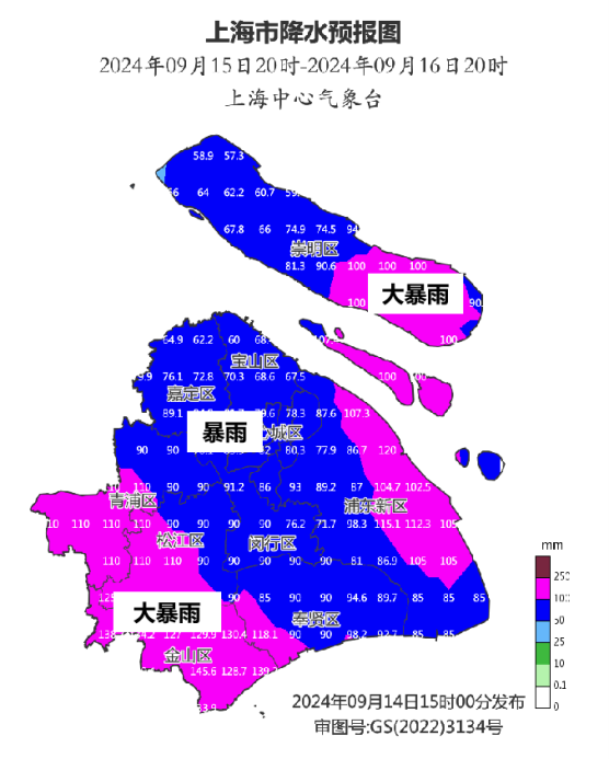 降雨方面,15日夜间到16日晚上,上海有暴雨到大暴雨,过程雨量60~90毫米,局部可达120~180毫米,最大小时雨强50~80毫米,主要强降水时段在16日凌晨至中午,傍晚之后雨势减弱。