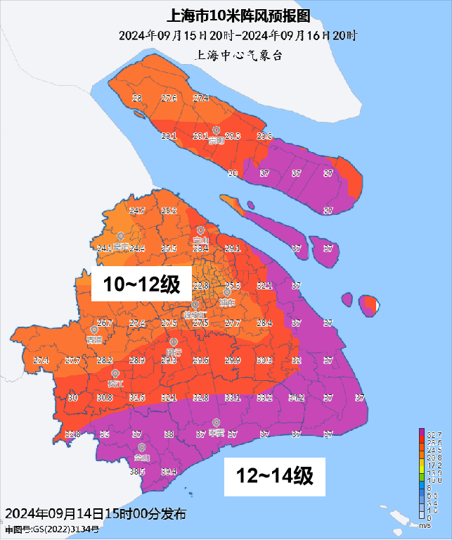 大风方面,15日中午开始,上海风力逐渐加大,预计持续到16日傍晚,其间陆地最大阵风9~11级,30米高空10级,60米高空11级,100米以上12级,陆家嘴三件套顶层可达12~14级,另外长江口和沿江沿海地区12~14级,洋山港区13~15级。