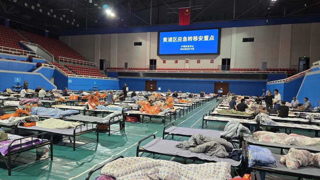 9月15日,澎湃新闻记者从上海市黄浦区获悉,卢湾体育中心迅速响应,将体育馆改建成避风港,为161名市政工人提供了一个温馨的临时安置点。