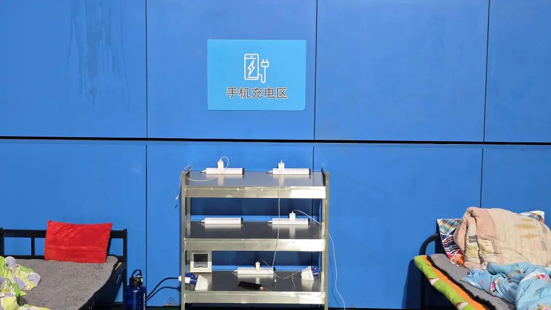 为了确保每一位市政工人的安全与舒适,体育中心提前准备了充足的床铺、饮用水、食物以及必要的医疗物资,还特地暖心地在四周布置了多个手机充电点,让安置进来的市政工人们倍感暖心。
