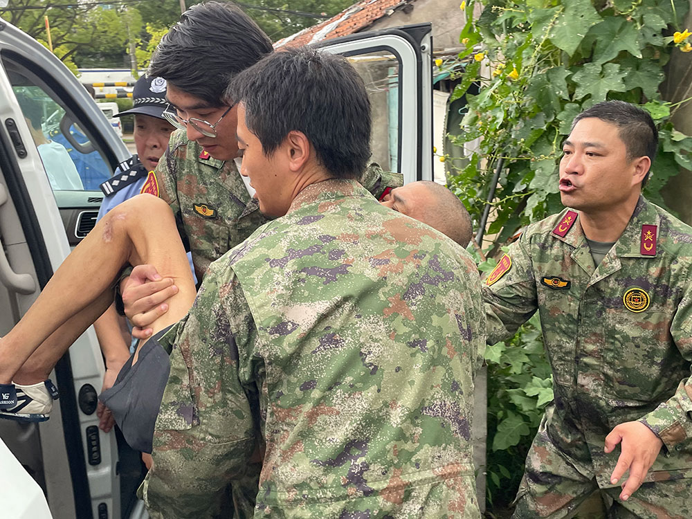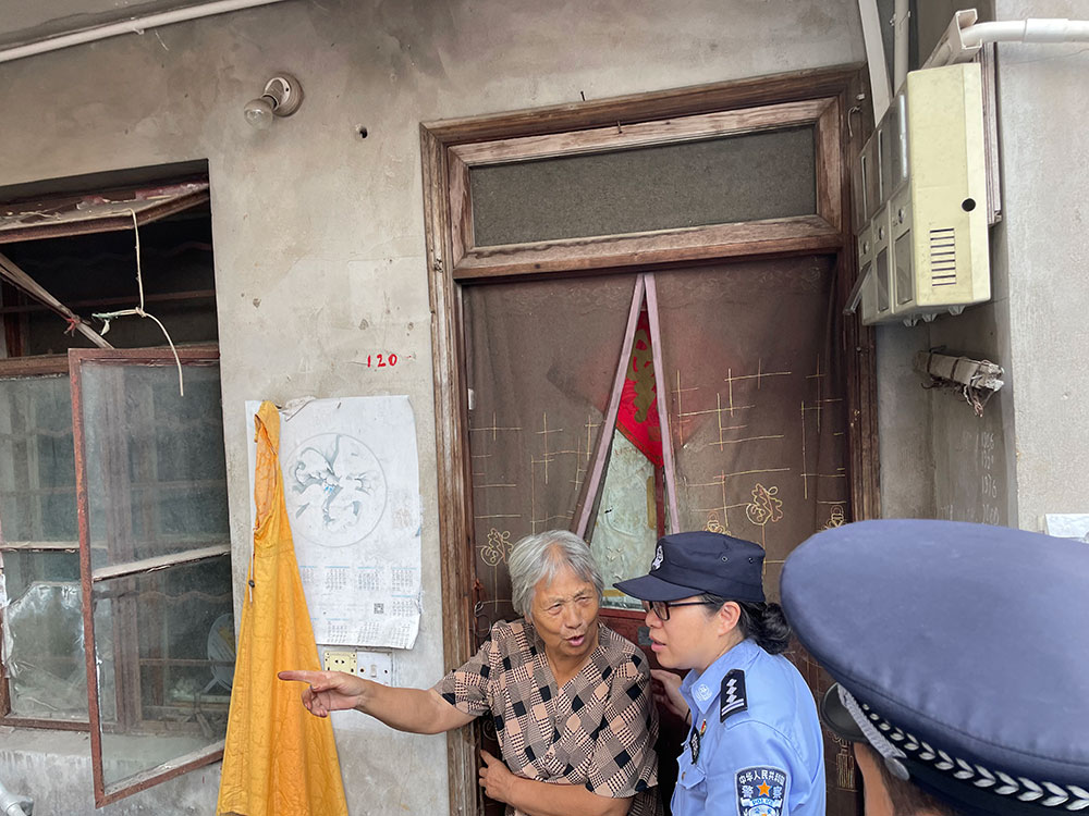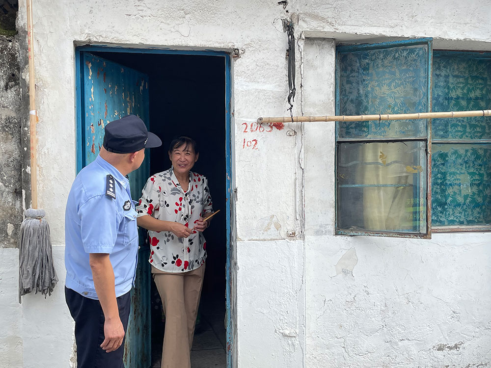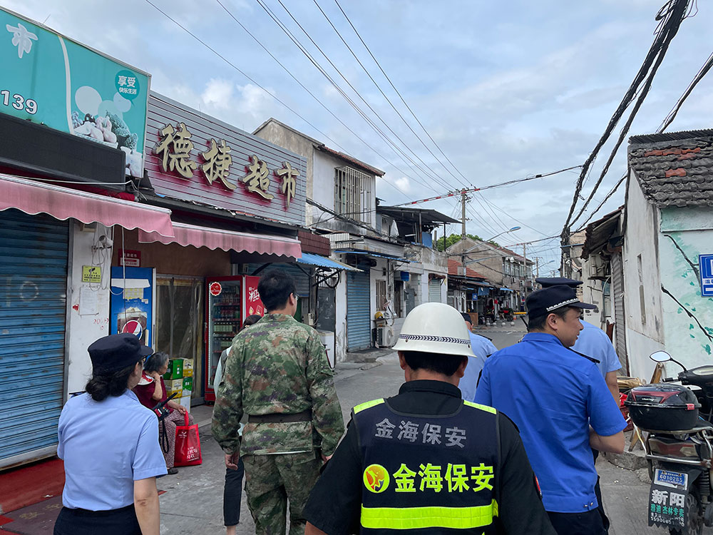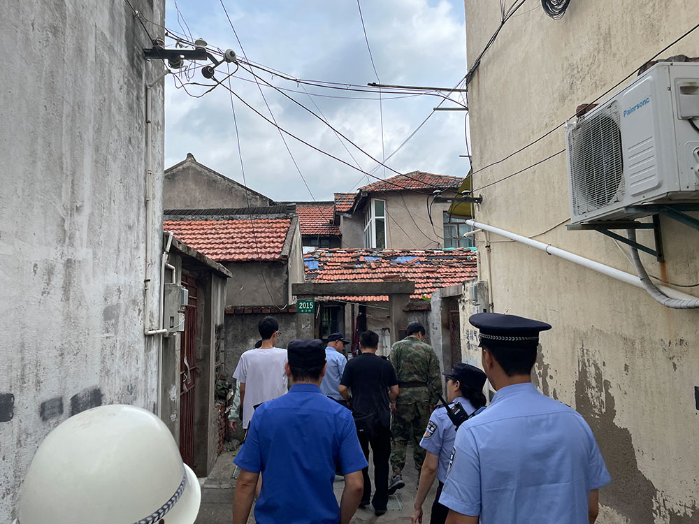 9月15日下午,金山区石化街道金卫三组居民区,社区民警和街道工作人员挨家挨户地巡查,提醒居民撤离安置。