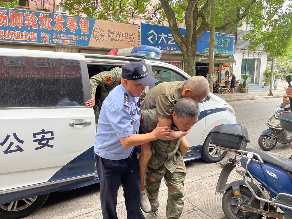 一位年过半百的老伯因脑梗而不能自主站立,民警将他背上警车转移至附近的酒店。