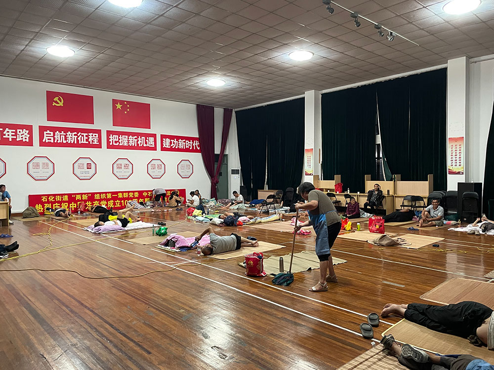 石化街道办事处副主任李翠竹介绍,该处安置点的总面积约为600平方米,可容纳超过100人。除了发放晚餐,石化街道还为转移安置居民准备了矿泉水、方便面、花露水、蚊香等各种物资。记者看到,角落处还堆放了数架折叠式的行军床,是为有特殊需求的居民准备的。