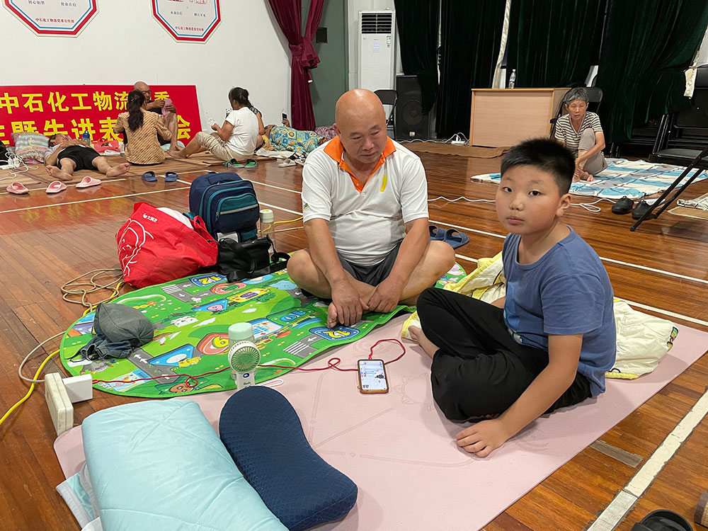 55岁的项波带着8岁的孙子坐在席子上。项波告诉记者,自己也是从四川绵阳来上海的务工人员,已经在金卫三组住了10多年。而其孙子今年正读小学二年级,最近刚刚开学,今天是孙子第二次经历撤离安置,他的爸爸妈妈都在上班,不能来到安置点陪他。虽是中秋假期,又碰上台风转移安置,他也把学校布置的作业带了过来——至于当晚会不会做,爷爷项波表示“要看他的心情”。